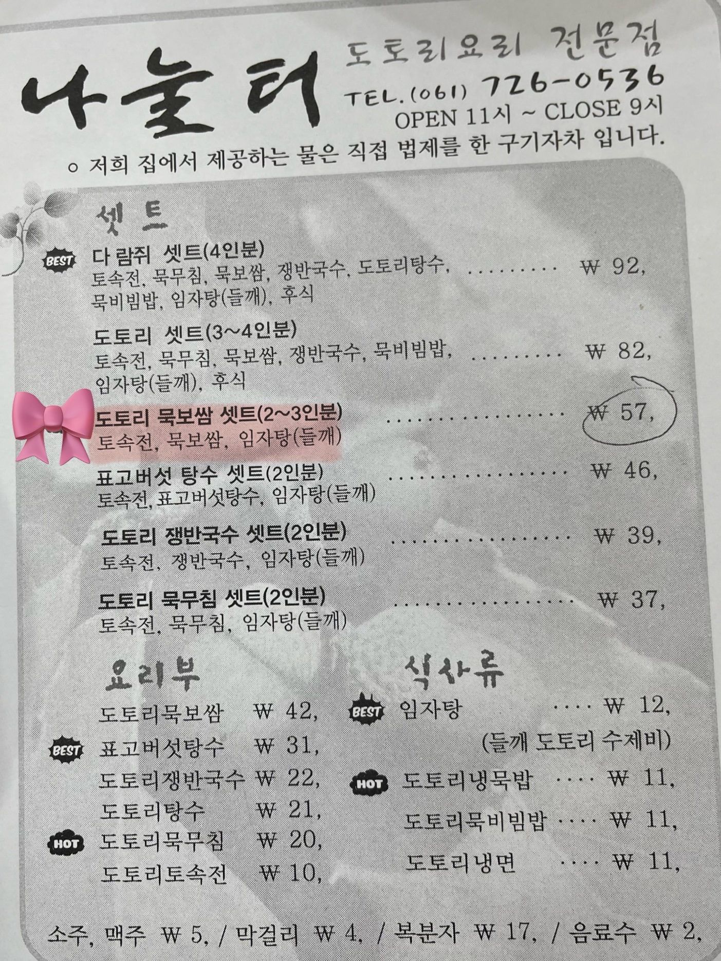 ✅ 주문 메뉴: 도토리 묵보쌈 세트 (2~3인분)